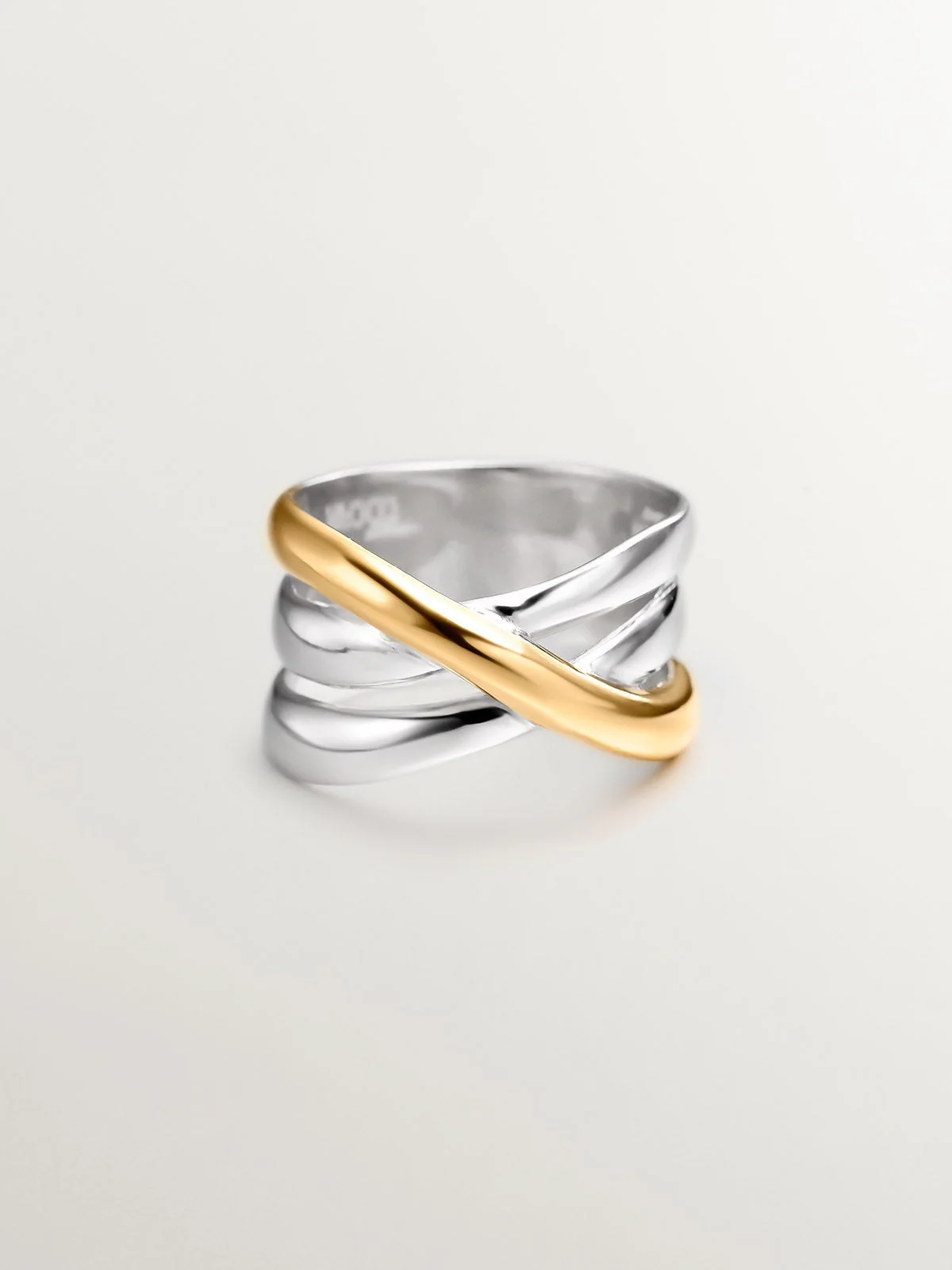Anillo ancho triple cruzado bicolor de plata 925 y plata 925 bañada en oro amarillo de 18K